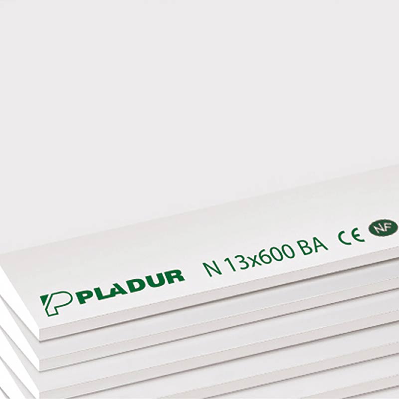 Placa de yeso laminado formada por un alma de yeso 100% natural íntimamente ligada a dos láminas de celulosa. Esta placa, por sus características, está catalogada como tipo A según la norma EN-520:2004 +A1 2009, es decir, es una placa de yeso laminado en una de cuyas caras se puede aplicar un enlucido a base de yeso apropiado o un acabado decorativo. Se identifica por su color frontal gris claro. Se caracteriza por tener un espesor nominal de 13 mm, por poseer un ancho nominal de 600 mm. Esta placa tiene sus bordes longitudinales recubiertos de cartón y configurados como Bordes Afinados (BA).